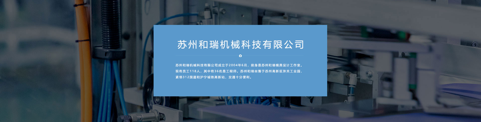 蘇州和瑞機(jī)械有限公司成立于2004年6月,前身是蘇州和瑞模具設(shè)計(jì)工作室。現(xiàn)有員工118人,其中有36名是工程師。蘇州和瑞坐落于蘇州高新區(qū)滸關(guān)工業(yè)園,緊鄰312國道和滬寧城鐵高新站,交通十分便利。